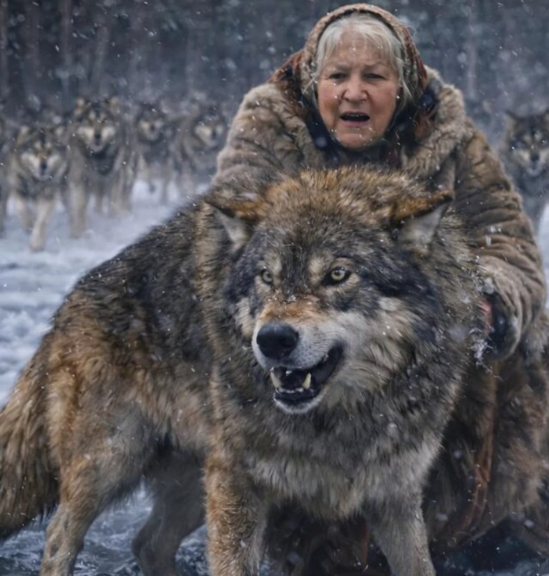 Lupul, ud și tremurând, zăcea pe gheață, aproape fără suflare; unul dintre picioarele din spate părea fracturat. Bătrâna, pregătindu-se să se retragă de teamă, simți mișcare în adâncul pădurii. Dintr-o dată, printre copaci, se zăriră zece perechi de ochi strălucind. Era haita lupului. Aceștia simțiseră prezența unui străin și se apropiau rapid. Femeia, realizând că nu are unde să fugă, rămase paralizată de spaimă.