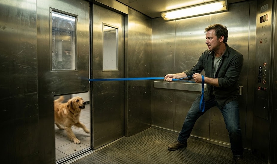 Podeaua a tresărit sub el, o smucitură grețoasă care anunța că senzorii de siguranță ai liftului reacționau în sfârșit la tensiune. Brian a simțit o clipă de plutire când cabina s-a oprit brusc între etaje. Luminile au clipit pentru ultima oară, apoi s-au stins, lăsând loc unor lumini roșii de urgență care au scăldat totul într-o nuanță sumbră. Nu a dat drumul. Simțea greutatea câinelui de partea cealaltă, lesa încă periculos de întinsă. Cu o ultimă smucitură disperată, Brian și-a proptit umărul în cadrul ușii și a tras frânghia în sus, sperând să obțină suficient joc ca să elibereze bucla din mecanism.